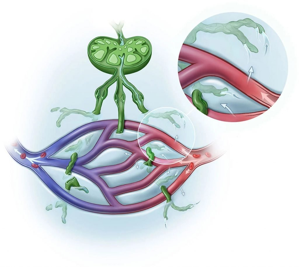 С током лимфы по мельчайшим капиллярам, а затем по более крупным сосудам "мусор" в виде бактериальных и грибково-паразитарных ядов простейших поступает в фильтры лимфосистемы - лимфатические узлы, где в значительной степени обезвреживается, потом по кровеносной системе всё это доставляется в печень, где и завершается окончательный процесс нейтрализации ядов.