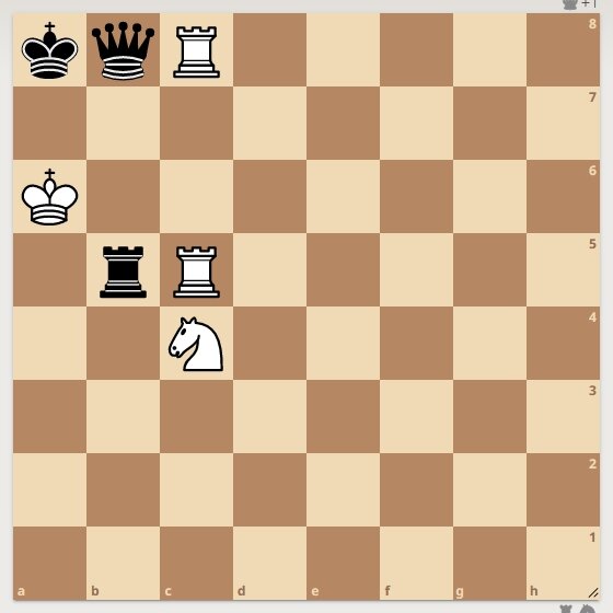 Автор задачи Г. Кардымон, 1988 г. Белые начинают и ставят мат в 3 хода. Спасибо, за лайк и комментарий. Решение смотрите далее. 1. Белые ставят ладью на "с7". 1. ...................... черные идут ладьей на "b7". Другие варианты пишите в комментариях. 2. Белые бьют ладьей на "b7". 2. ......................... черные бьют ладью на "с8". 3. Белые ставят мат конем на "b6". Следующая задача тут