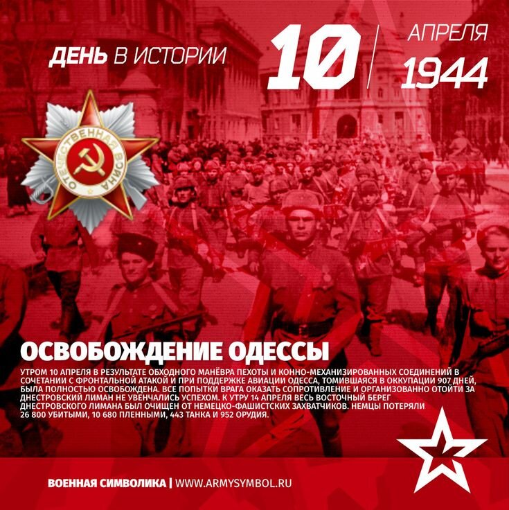 Очередная сводка Совинформбюро скупо сообщила: "Войска 3-го Украинского фронта сегодня, 10 апреля, в результате умелого обходного маневра конницы и конно-механизированных соединений в сочетании с фронтальной атакой овладели важным хозяйственно-политическим центром страны, областным городом Украины и первоклассным портом на Черном море — Одесса, мощным опорным пунктом обороны немцев, прикрывающим пути к центральным районам Румынии…" Москва отпраздновала эту победу 24 залпами из 324 артиллерийских орудий.