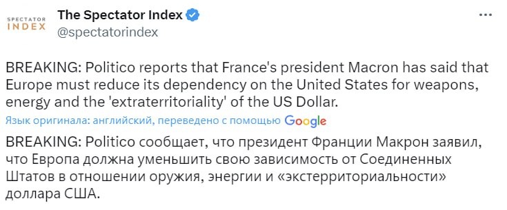 🗣 Макрон: Европа должна снизить свою зависимость от США в отношении оружия, энергии и экстерриториальности доллара