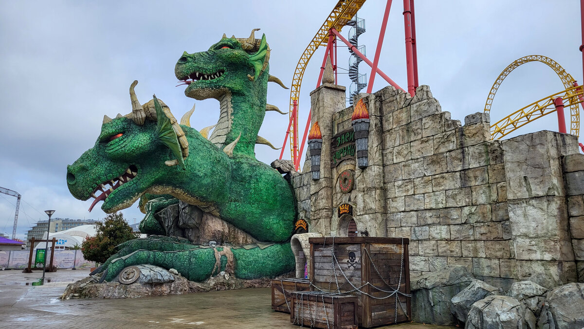 В посёлке городского типа Сириус, располагающимся совсем рядом с районом Адлер города Сочи, находится один из самых лучших парков развлечений России - Сочи-парк. Конкуренцию ему могут составить только Диво-остров в Санкт-Петербурге и Остров мечты в Москве. Но у Сочи-парка есть одно неоспоримое преимущество - он расположен в месте с тёплым климатом, благодаря чему помимо классических аттракционов в нём имеется зона с аква-активностями. Чем-то он напоминает турецкий The land of legends, но без аквапарка. Во время моей поездки в апреле 2023 года все аква-аттракционы были закрыты на ремонт + строили новые, поэтому их фотографий здесь не будет. Первое, что бросается в глаза ещё не дойдя до парка - огромные экстремальные аттракционы, которые видны на большом расстоянии. Это американские горки в двух вариациях, катапульта со свободным падением, вращающийся маятник и другие. Парк, начиная с входной зоны, встречает посетителей необычной архитектурой - очень яркие и красивые деревянные дома, неп