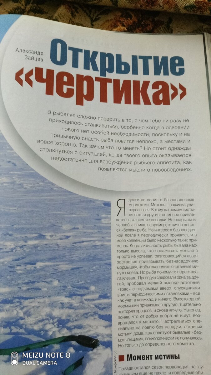 Вчера читал статью Александра Зайцева известный в кругах безмотыльщиков название статьи « Открытие ,чертика,» в журнале «Рыбачьте с нами» от 01 января 2009 в рубрике для начинающих рыбаков. Где он в качестве эксперимента к чертику подсаживать менять искусственные насадки это различный бисер, менять сочетания бисера, цвет бисере, оснащать паралоном или силиконом крючки чертика. Он также советует что при остожных поклевках можно использовать живые подсадки например подсадить мелкого опарыша, личинку чернобыльника или мотыля на один из крючков чертика. Прилагаю фото с журнала его совета как доказательства Меня немного это даже возмутило как опытный безмотыльщик для многих гуру безмотылки дает в качестве совета использования живой насадки для улучшения клева.После таких советов можно усомниться в искусстве ловле гуру на безмотылку и подорвать авторитет Александра. Это ведь советы начинающим рыбакам. Но я думаю не корректно советовать начинающим рыбакам использовать живые насадки