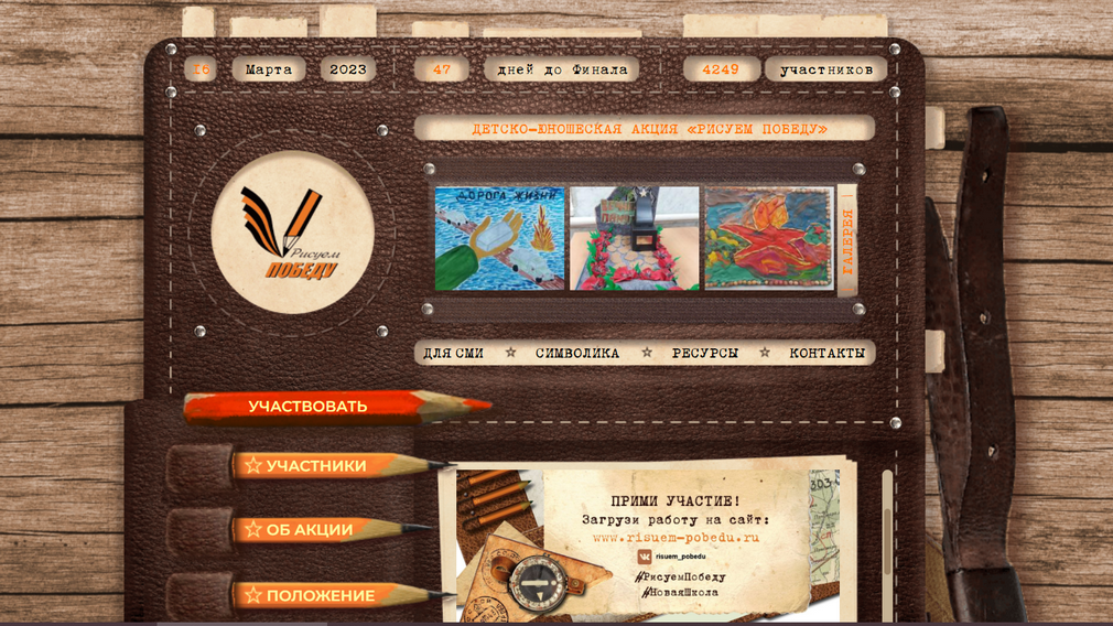 В России и странах СНГ начался новый сезон патриотической акции «Рисуем Победу». Заявки принимаются по двум традиционным номинациям: «детское художественное творчество и декоративно-прикладное искусство» и «методическая разработка». Кроме того в текущем году добавлены новые номинации. Это «Наследники Великой Победы» (посвящена доблести армии России) и «Рисуем Победу»: наш опыт». Работы принимаются в дистанционном формате через сайт акции Рисуем Победу с 23 февраля до 1 мая этого года. Итоги акции «Рисуем Победу-2023» подведут в День Победы. ФОТО: скриншот сайта «Рисуем Победу» Жители Брянской области могут принять участие в акции «Рисуем Победу»