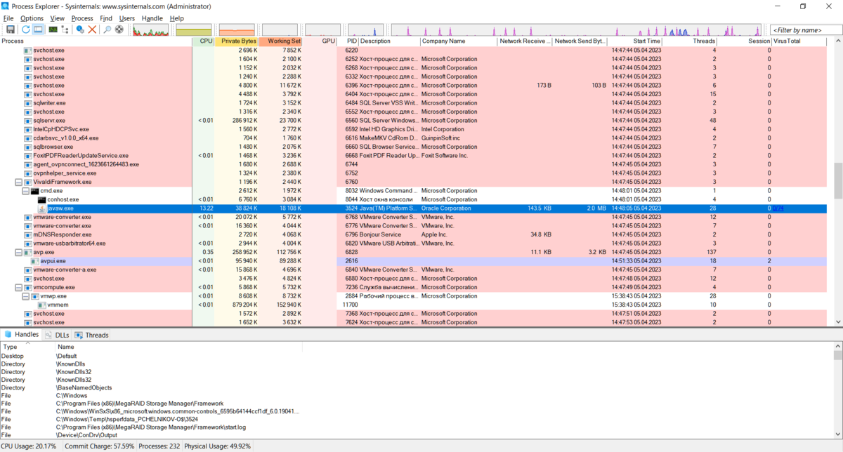 Окно Process Explorer состоит из двух частей. В верхнем окне всегда отображается список активных в настоящее время процессов, включая имена учетных записей. Сведения, отображаемые в нижнем окне, зависят от режима, в котором находится Process Explorer: если он находится в режиме дескриптора, вы увидите дескрипторы, выбранные в верхнем окне; если в режиме DLL — вы увидите библиотеки DLL и сопоставленные в памяти файлы.