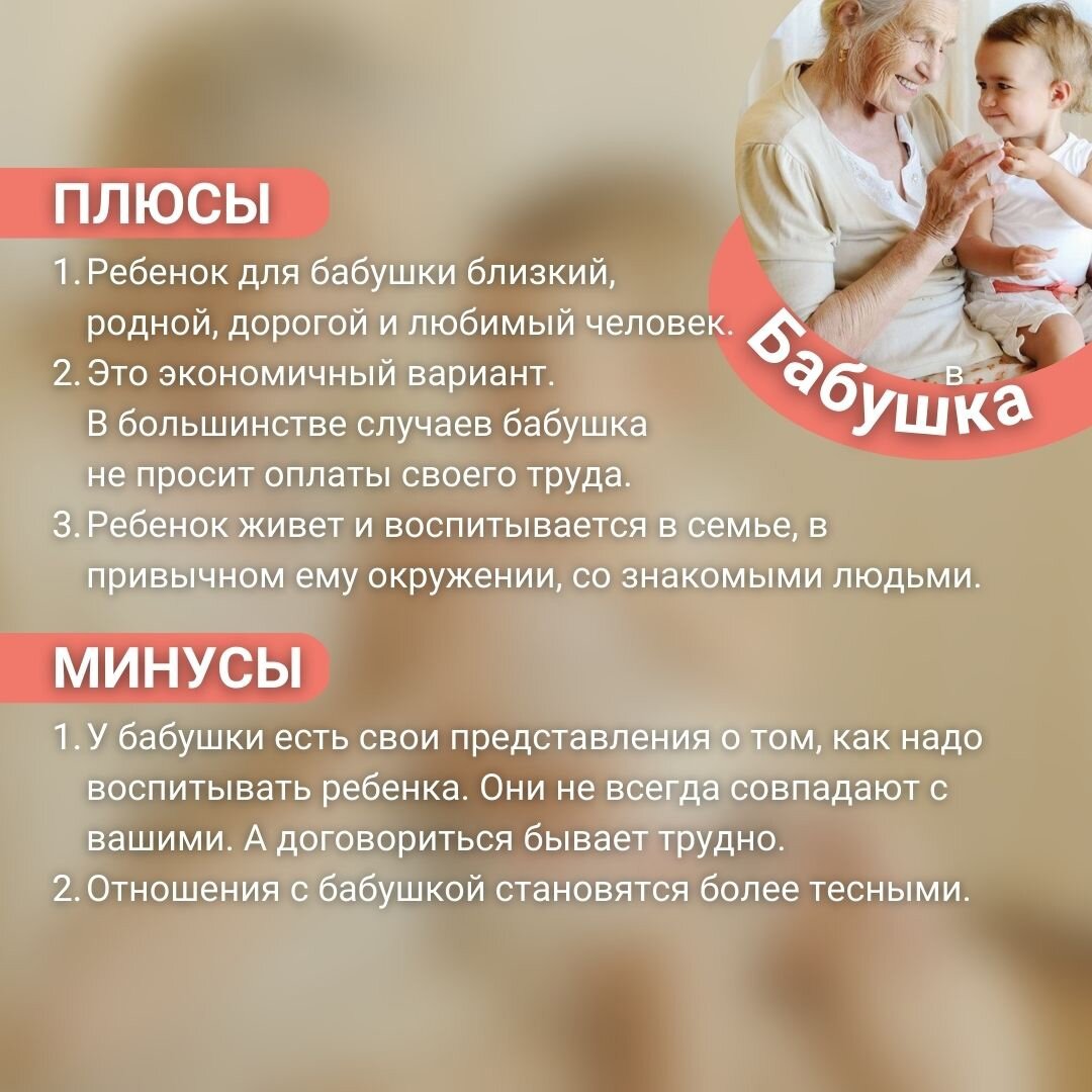 Няня, воспитатель, репетитор, тренер, врач – это специалисты и их может быть одновременно много или поочередно. И они никогда не заменят никого из родных, в том числе бабушку. Выбор в таком ответственном деле всегда определяется сложным сочетанием ваших возможностей, предпочтений и готовности вкладываться. Плюсы и минусы выбора няни или бабушки мы привели в карусели. Мы рекомендуем все-таки нанимать няню.