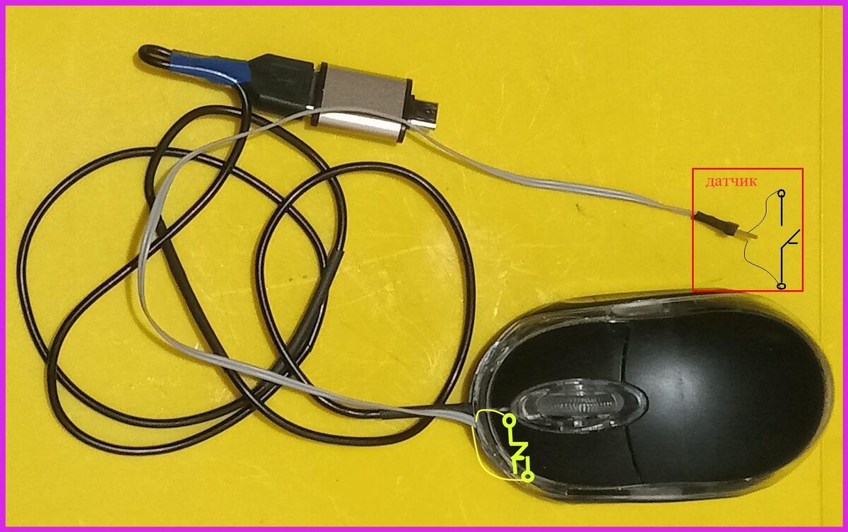 Для реализации этого изделия необходимо только небольшая модернизация мышки - сделать отвод от ее левой кнопки, для подключения к датчику на намоточном устройстве. Для подсчета импульсов надо использовать режим "Калькулятор" на ноутбуке и смартфоне. На смартфоне установить программу "Калькулятор" с режимом памяти, которая при нажатии на клавишу суммирования единицы ведет подсчет импульсов поступивших от датчика на клавишу мышки. Перед этим подключить мышку к смартфону через OTG и установить курсор на клавишу суммирования в памяти калькулятора. Также для смартфона в магазине Google Play есть программа "Счетчик", которая предъявляет меньшие требования к позиционированию курсора мышки. В дальнейшем ход проведенных испытаний показал, что при использовании калькулятора ноутбука лучше использовать две лазерные мышки - без модернизации и модернизированную, у которой изолентой заклеен лазер и она используется только для приема импульсов, при этом, перемещение мышки не приводит к перемещению к