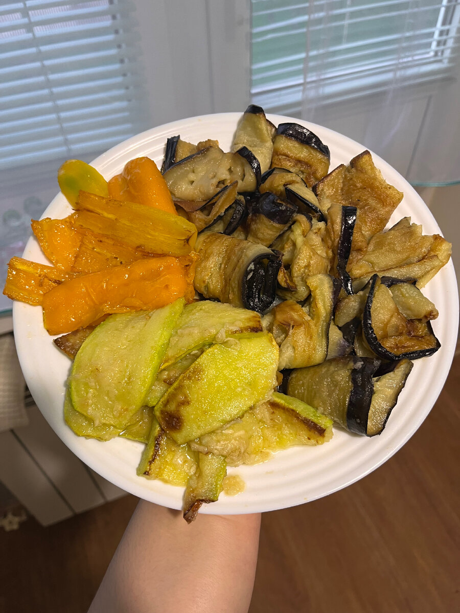 Берем всё в том кол-ве , которое вам нужно. Овощи моем, режем в произвольной форме. Баклажан и кабачок перед жаркой обваливаем в муке(солим в конце). Жарим до мягкости и румяной корочки. Перчик жарим в конце. Так же, до мягкости. Овощи в конце солим и добавить можно чесночок. ❕Совет: когда при жарке мука будет начинать гореть, лопаткой уберите ее вместе с маслом и жарьте дальше на новом масле.