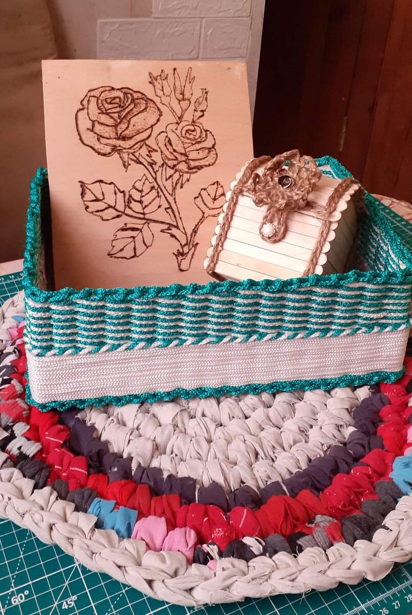 Вот такие подарочки - самоделки у нас с детками получились. Это коврик многофункциональный вязаный, шкатулка из палочек от мороженого, картина выжженная роза ну и собственно корзина - органайзер.