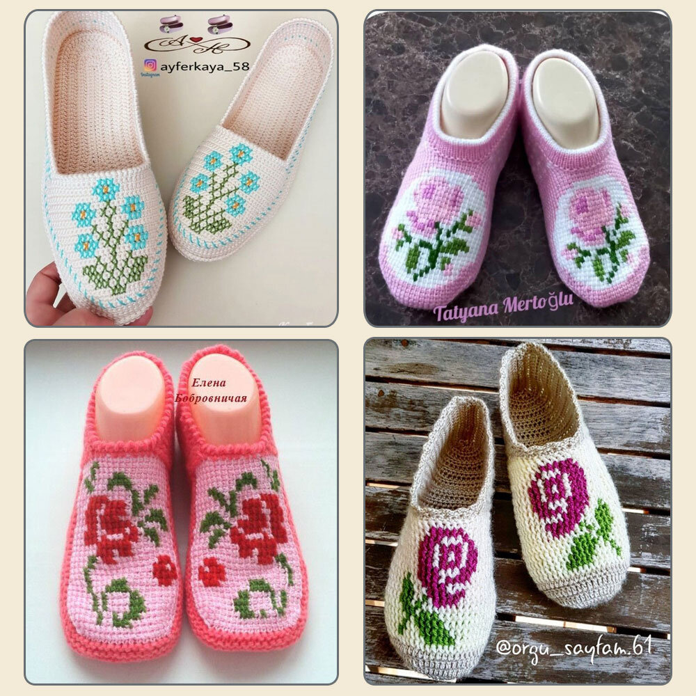 Вязаные тапочки с вышивкой крестиком. 16 вариантов дизайна.