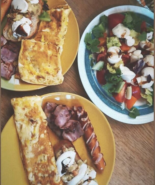 Ингридиенты : Микс салатов Помидоры розовые 2 шт Мацарелла 2 упаковки Яйца 6 шт Тунец 1 банка Бекон 1 упаковка Сосиски куриные 1 упаковка Соль и перец по вкусу Бальзамический соус . Готовим салат: в тарелку добавляем микс салатов , помидоры режем произвольно , мацареллу добавляем, сбрызгиваем соком лимона , и бальзамическим соусом. Дальше взбиваем яйца с солью и перцем и на разогретую сковородку сначала выливаем смесь, обжариваем и скручиваем как рулет на сковородке . И так же повторяем второй рулет . Затем обжариваем бекон и сосиски . Итак выкладываем на тарелку яичный рулет , бекон и бутерброд с мацарелой и тунцом . Сверху бальзамический соус . И конечно салатик 💚 Приятного завтрака ❤️