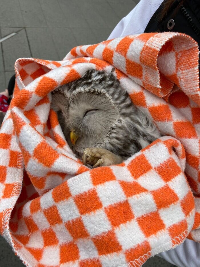 В это солнечное утро, одна из создательниц и ведущих активистов нашего центра отводила своего ребенка в детский сад, когда увидела на дороге сову. Рядом не было никаких писем, но вороны кружили над ней и готовы были нанести урон. Двое студентов смотрели и не знали, что делать с этой пернатой красавицей. Поймать ее голыми руками было неприятной и даже страшной мыслью. Нельзя забывать, что когти у совы - очень большие. Однако, удалось поймать ее, накрыв детским одеялом. В этом уютном убежище сова моментально уснула. Пока студенты фотографировались с совой (надо же доказать в институте, что задержались по уважительной причине), наша коллега усердно звонила в МЧС, калужское лесничество и другие организации, в надежде получить помощь для пернатой пассажирки. Однако организации работают по жесткому графику и начинают работу только с 9: 00 утра. А гулять с совой и двумя детьми не очень удобно. Коллеге удалось связаться с центром реабилитации для диких животных, который откликнулся на просьбу