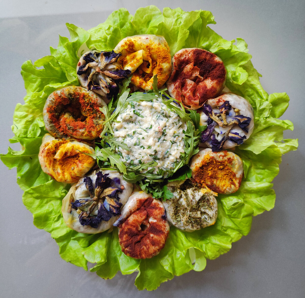Приветствую вас! Сегодня блюдо, которое можно сделать и постным, и скоромным - голубцы. Отделяем от кочана листья и варим их до полуготовности, чтобы стали мягкие. Разрезаем на две части вдоль, вырезая кочерыжку. Закладываем начинку, сворачиваем рулетиком, а затем делаем "улитку". Чем больше капустный лист, тем больше спиралек у "улитки". У меня был некрупный кочан, поэтому, чтобы кончики не раскручивались, я два голубца скрепляла между собой зубочисткой. Начинку вы можете сделать любую. У меня с фаршем (можно заменить на грибы), овощами и сухой гречкой. Фарш с овощами потушила до полуготовности, затем добавила сухой гречки и завернула в голубцы. Тушить в сковороде под крышкой до готовности в небольшом количестве воды. За 5 мин до окончания готовки посыпать специями - сладкой паприкой, куркумой, сухой зеленью. Я ещё украсила цветками синего чая. Выложить на блюдо, убрав зубочистки (голубцы уже не развалятся). Соус - натёртый на мелкой тёрке дайкон, хрен готовый, чеснок, смесь перцев