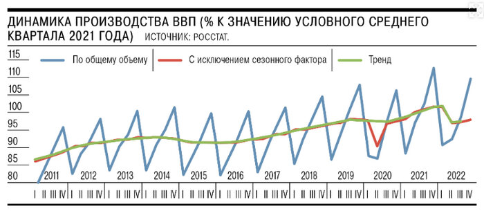 Когда рынку делать нечего, он... реализует понижательное давление на курс рубля. А все эксперты, журналисты и сотрудники ЦБ занимаются обсуждением причин падения курса. Новости дня: 1. Росстат осуществил вторую оценку ВВП за 2022 год, актуализировал данные за три его квартала и выполнил первую оценку ВВП за IV квартал 2022 года.// И получилось так себе. Статистика тревожная. Главное - пересмотрен дефлятор ВВП с 14, 3% до 15, 8%. То есть инфляция по экономике в целом (а не только потребительская) составила 15, 8%. Сезонно сглаженная динамика поквартального ВВП фиксирует обвал потребительского спроса и резкое сокращение запасов, что привело к резкому падению экономики на 4, 6% во втором квартале. В третьем квартале восстановление запасов и накопление основного капитала привели к приросту экономики на 0, 5%, который сохранился и в четвертом квартале. Но этот рост не выглядит динамичным... Такой рост больше напоминает стабилизацию, а не восстановление. https://www.kommersant.ru/doc/5925861