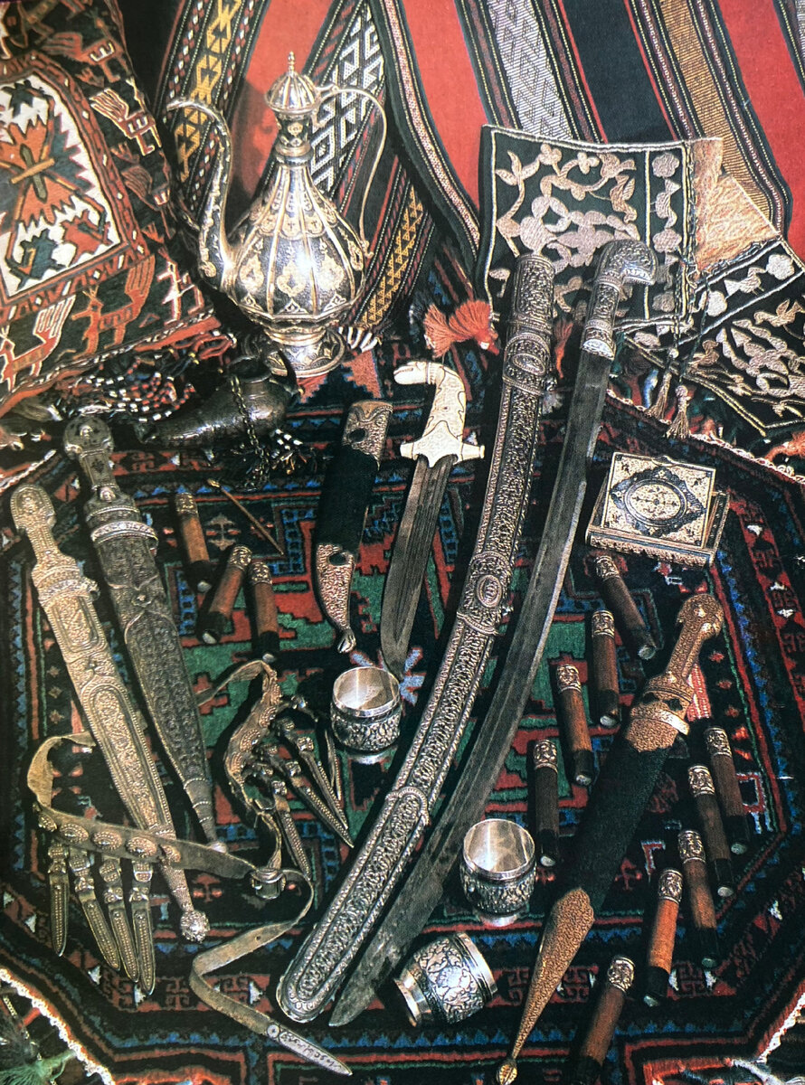 B XVIII - начале XX века ювелирное искусство Дагестана достигло расцвета: литье, ковка, филигрань, гравировка, чернение, эмаль, различные виды насечек по металлу, кости и камню. В дагестанских селениях всегда жили мастера-серебряники.Они делали недорогое парадное оружие для продажи в городах, и всевозможные украшения, часто по конкретному заказу - для жителей своего аула. Дом мастера служил, как правило, и ма-стерской, и школой для начинающих. На территории Дагестана издавна существовали "вольные общества" - союзы нескольких сельских общин, в каждом из которых женщины имели свой специфический ансамбль украшений. По их форме и орнаменту можно было узнать даже название аула. Солнечные знаки на головных и височных бляхах выполняли роль оберега. Народное воображение наделяло этими свойствами и сам металл. С его культом связана традиция украшения платья невесты. В XIX веке оно сплошь покрывалось различными серебряными пряжками и подвесками. Помимо солнечных знаков в орнаменте часто вст