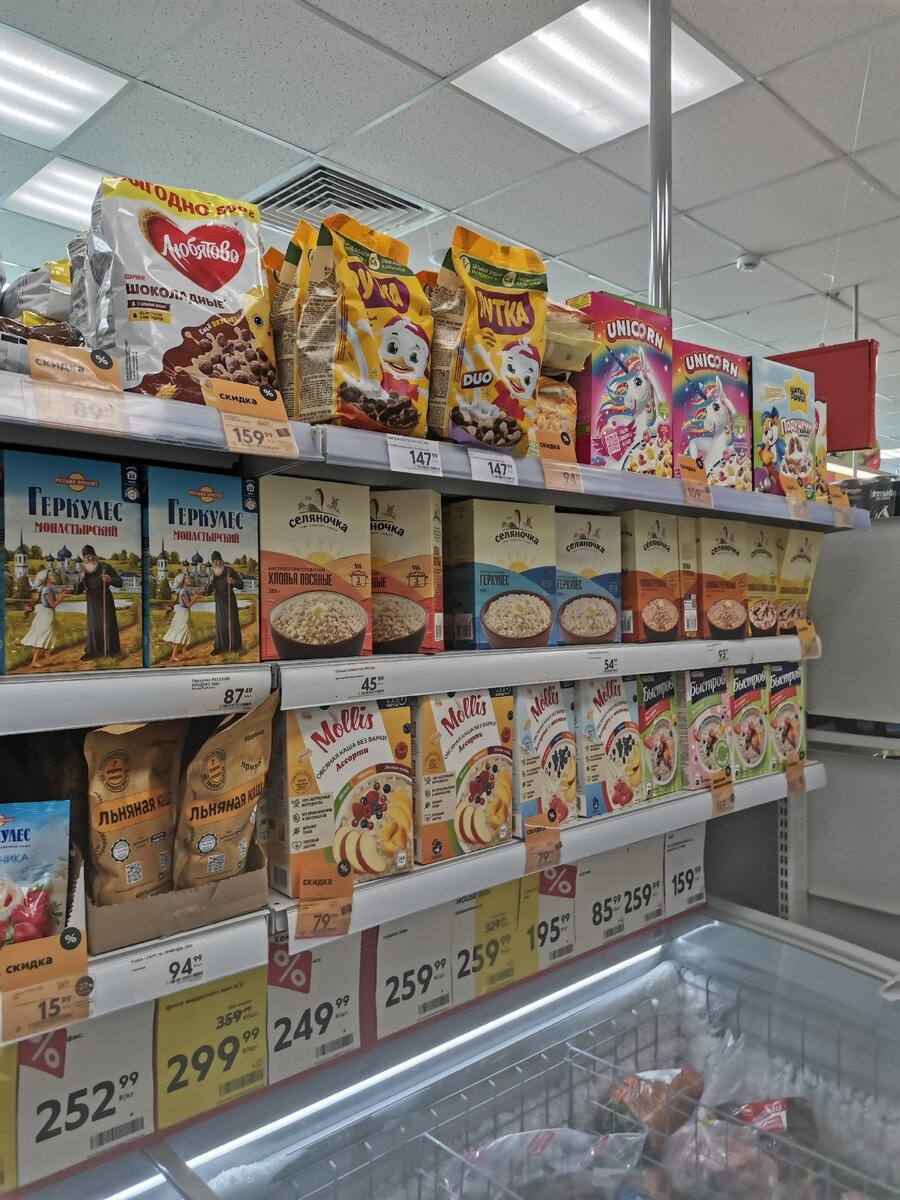 Так давно не рассказывала о скидках на продукты для завтрака, что решила начать именно с них. Не скажу что большой фанат хлопьев, но все-таки иногда прямо-таки хочется их, поэтому самое время было поискать скидки: большая упаковка шоколадных шариков от "Любятово" стоит 159 рублей, маленькая - 89; подушечки с шоколадной начинкой - 89, фруктовые хлопья с единорогом на упаковке - 109, рядом с ними были медовые хлопья за 94 рубля.