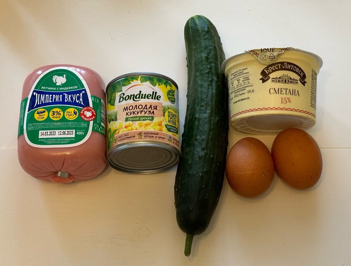 Мы дома очень любим готовить на ужин легкие во всех смыслах салаты - из простых продуктов, быстрые в приготовлении и не слишком калорийные. Подписывайтесь на мой канал, Буду делиться простыми и вкусными рецептами, которые мы любим готовить дома. Что нам потребуется? На 2 порции: Как приготовить? Для начала отвариваем яйца вкрутую. Для того, чтобы яйца сварились вкрутую, кипеть они должны примерно минут 10. Нарезаем ветчину кубиками. Я взяла ветчину из индейки - с ней салат получается менее калорийный. Огурцы нарезаем соломкой. Огурцы лучше брать менее водянистого сорта, чтобы в салате не было слишком много влаги. В емкость, удобную для смешивания, выкладываем последовательно нарезанные яйца, ветчину, огурец и кукурузу. В качестве специй я использую черный молотый перец и соль. Вы можете добавлять специи по вашему вкусу, но как мне кажется, любые другие специи в этом салате портят его вкус. Добавляем сметану и аккуратно перемешиваем. Наш салат готов! На его приготовление