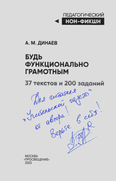 В издательстве «Просвещение» вышло пособие «Будь функционально грамотным. 37 текстов и 200 заданий», направленное на улучшение профессиональных навыков педагога. Автор сборника – абсолютный победитель Всероссийского конкурса «Учитель года Росси»-2018, победитель Всероссийского конкурса просветителей «Лига лекторов» Алихан Мавладиевич Динаев. У подписчиков «Учительской газеты» есть уникальный шанс получить эту книгу с автографом автора! Пособие призвано помочь как учителям, так и будущим педагогам развить свою функциональную грамотность (ФГ) – читательскую, математическую, естественно-научную, финансовую, а также стать более креативными. «Мы так привыкли развивать функциональную грамотность у наших детей, что редко задумываемся над тем, как обстоят с ней дела у нас, педагогов. Если мы хотим научить детей применять свои знания и навыки на практике, то в первую очередь должны научиться делать это сами», – утверждает в предисловии Алихан Динаев. В книге сделан акцент на развитии читательск