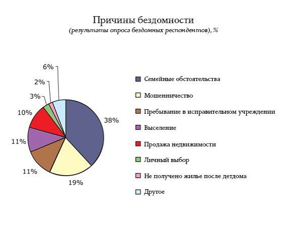 Как бы это было не приятно говорить, но ведущая причина бездомности для работоспособного - зависимость от психоактивных веществ ( алкоголь, наркотики). А все вышеперечисленные причины - следствие. Конечно я не исключаю эти причины как основные для ряда бездомных. Но в процентном соотношении если смотреть истоки, то будет другое соотношение причин. Что имею в виду приведу ряд примеров из жизни.