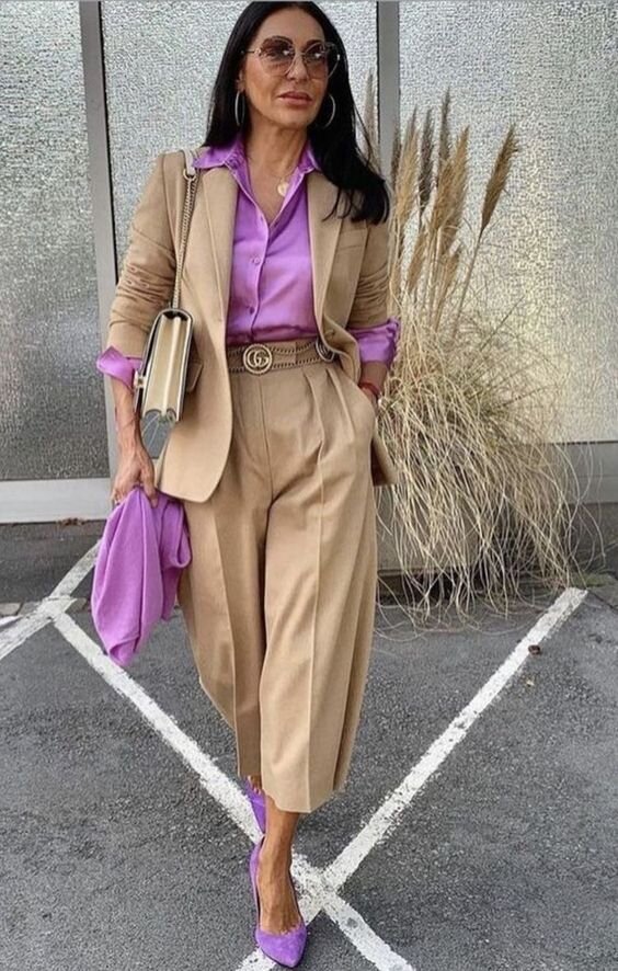 - Интересный брючный костюм светлого оттенка бежевого цвета. В комплект входит пиджак классического покроя со слегка приталенным силуэтом и широкие укороченные брюки. Брюки с завышенной посадкой, складками у пояса и широкими по всей длине штанинами. Длина штанин – до середины икры. К костюму выбрали сиреневую рубашку и палантин того же цвета, туфли также сиреневые, но несколько другого оттенка.