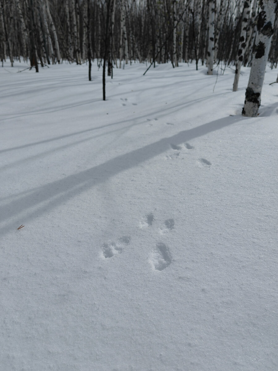 В воскресенье была совершена замечательная прогулка. Я постоянно опасалась вновь повстречать большую свору бездомных собак, что уже имело место недавно. Тем не менее мне удалось углубиться в лес довольно далеко, следуя по твёрдому насту вдоль линии электропередач. Кругом стоял густой лес. Основу его составляли высокие стройные осины, разбавленные в той или иной мере березами, соснами и кедрами. На снегу попадались заячьи следы. Небо, бывшее ясным и солнечным ранним утром, к 10 утра покрылось ровной белой пленкой облаков. И вот тут, когда я довольно далеко ушла по просеке, вокруг солнца прорисовался широкий круглый ореол - гало. Просека вывела меня на широкое болото, выглядящее как снежная равнина с редкими низенькими соснами и кедрами. ЛЭП разветвилась: часть уходила направо к дачному поселку, часть шла направо, куда мне и нужно было идти. Я должна была выйти к озеру, чтобы широким кругом вернуться обратно. Так и вышло. Через некоторое время в сторону озера от просеки ответвилась еле