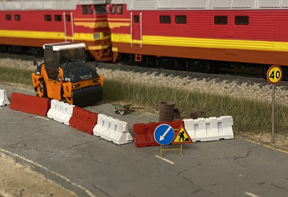 Внимание! В связи с проведением ремонтных работ, связанных с плановой заменой подземных коммуникаций и частичным ремонтом дорожного полотна, проезд по улице Озерная будет частично закрыт до 1 сентября. Для движения будет доступна одна полоса в сторону центра. Приносим извинения за доставленные неудобства. Знакомая ситуация, не правда ли? Вот и у нас дорога перекрыта частично до конца лета. И все бы ничего, если бы не одно "но"... Осень в этом городе не наступит никогда, потому что на этом макете вечное лето! Вот, что значит "вечный ремонт"... Для того, чтобы показать на макете ремонтные работы на участке дороги сейчас в принципе есть необходимый минимум. При этом все детали и элементы сделаны в очень хорошем качестве. В результате картинка пока получается вполне симпатичная. В качестве антуража для изображения ремонта задействованы: Блоки пластиковые рельефные производства Salivan Green; Блоки пластиковые плоские производства Salivan Green; Набор дорожных знаков "Дорожные работы", цв
