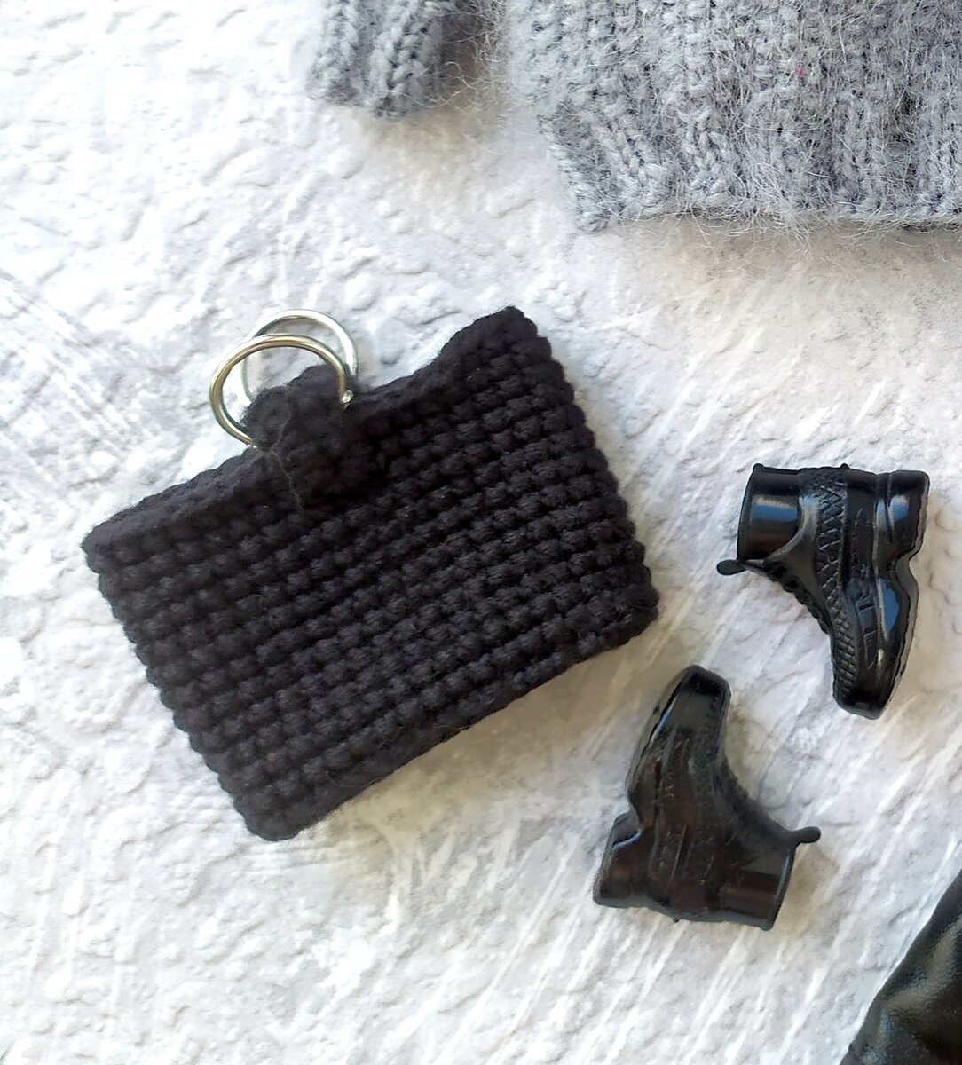 Сумочка с кольцами для кукол. Дно: 1р - 15в.п., во 2ю от крючка петлю 13сбн, пр из 3сбн, 13сбн, пр из 3сбн (32) последнюю пр из 3 вяжем в перемычку, образованную при вязании в начале ряда во 2ю от крючка петлю. 2р - (13,пр) х 2 раза (38) 3р - за заднюю стенку - 38сбн 4р - 38сбн Из картона вырезаем овал, равный дну, обтягиваем тканью и пришиваем к дну сумочки. 5р - 15р (11рядов) Петли для ручек: 8в.п., во 2ю от крючка петю 7сбн. = 2шт. Вставляем кольца (диаметр выбираем по желанию), пришиваем петли с кольцами по центру сумочки.