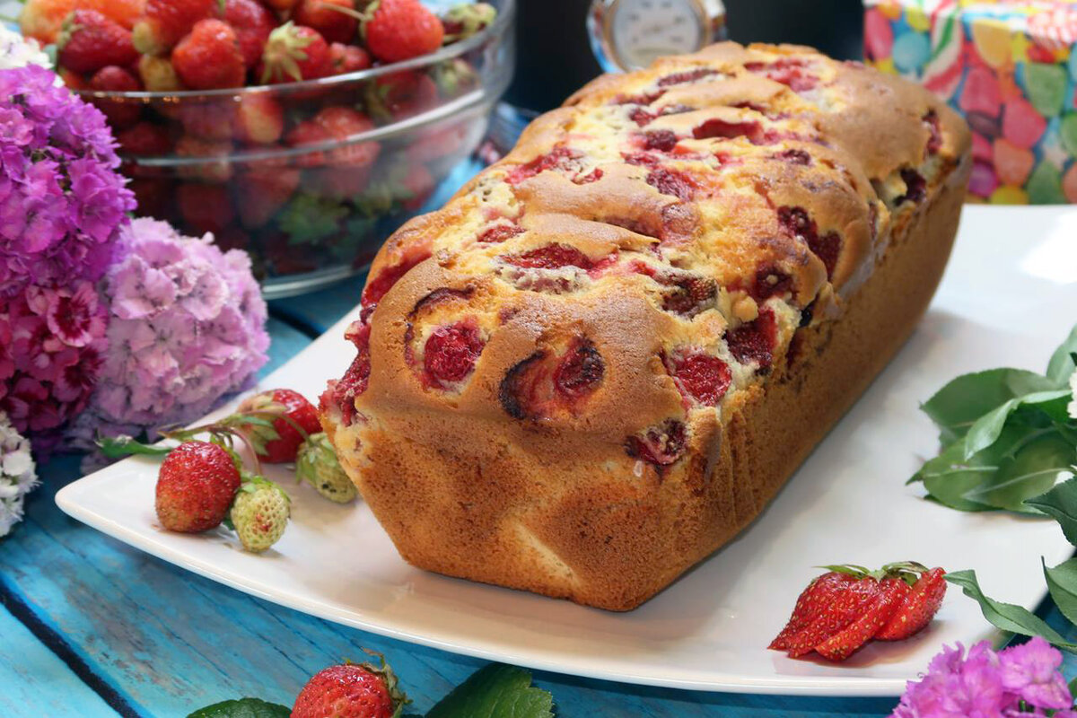 Это простой рецепт приготовления нежного, сочного и ароматного кекса с клубникой в духовке. Для тех, кто любит краткие рецепты Ингредиенты: Клубника свежая – 250 г Мука пшеничная - 270 г Сахар – 165 г Молоко – 100 мл Масло растительное – 100 мл Яйцо куриное – 3 шт. Разрыхлитель – 10 г Ванилин – 1 г Соль – щепотка 1. В чашу для взбивания кладём куриные яйца, сахар и ванилин. 2. При помощи миксера взбиваем их до получения пышной, светлой массы. 3. Не прекращая взбивать, тонкой струйкой вливаем 100 миллилитров растительного масла. 4. Следом добавляем всё молоко и перемешиваем. 5. Далее добавляем муку, разрыхлитель и соль. 6. Всё перемешиваем до однородной массы, но не долго. В итоге тесто для кекса получается кремообразным, очень гладким, нежным и однородным. 7. Перекладываем тесто для кекса в предварительно подготовленную форму. У меня форма размером 28*8 см. Дно и стенки формы застилаем отрезами пергаментной бумаги. Чтобы бумага не двигалась, на время закрепляем её к стенкам обычными ка