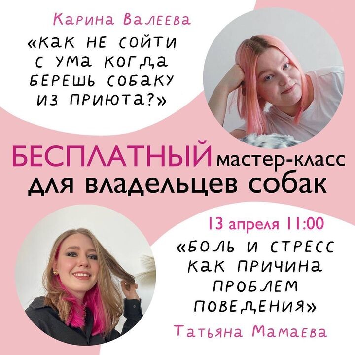 Два гуманных кинолога из Уфы разберут темы: ❓Как не сойти с ума, когда берешь собаку из приюта ❓Боль и стресс как причина проблем поведения у собак Если ваша собака ▪️ведет себя агрессивно ▪️писается дома, на диваны и кровати ▪️много лает ▪️ведет себя на улице агрессивно или непредсказуемо без причины ▪️рычит или кидается на других собак ▪️подбирает еду или несъедобные предметы на улице А также если вы: ▪️хотите понять, в каких ситуациях поведение может сигнализировать о боли, и есть смысл показать собаку ветеринару, а когда лучше к кинологу — работать с поведением; ▪️ недавно взяли собаку из приюта и не знаете, как с ней справиться ▪️планируете взять собаку с улицы или из приюта и хотите подготовиться хотите понять, почему у собаки изменилось поведение дома: взяли милашку, а она превратилась в монстра Спикеры: Татьяна Мамаева @kinologscorgi 🔸Член ассоциации гуманных кинологов России 🔸Участник международной конференции гуманных кинологов Карина Валеева @karinadogbehavioris
