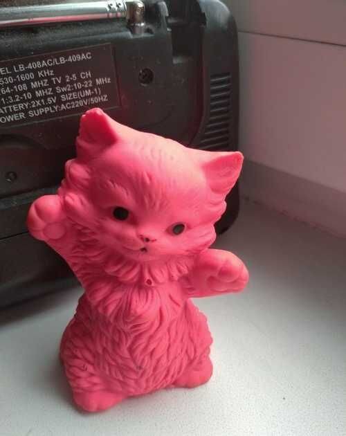 Я тут обычно про кота рассказываю, потому что коты это добро и позитив, но иногда хочется поделиться просто хорошей историей не про котов. Но это не тот случай, потому что всё равно буду рассказывать сейчас про котов. Правда, про игрушечных. Был у меня в детстве очаровательный резиновый котёнок. Вот как на фото, маленькая розовая кошечка, которая очень нравилась и взрослым, и детям. Имени у неё не было, так и называли "розовая кошечка". Кто помнит советские игрушки, коты там были разные, часто смешные, антропоморфные, жалобные, даже криповые, а вот такую милую кошечку я знаю только одну. Она вроде бы выпускалась в двух цветах, жёлтая и розовая. То ли фото плохо передаёт тот самый розовый оттенок, то ли в детстве все цвета были ярче и сочнее, но моя кошечка была просто какого-то невероятно приятного цвета. И наощупь тоже очень интересная, такая довольно мягкая резина. Я ещё помню, мне очень хотелось кусать котёнка за уши или хотя бы просто проводить ушами по дёснам, было в этом какое-то