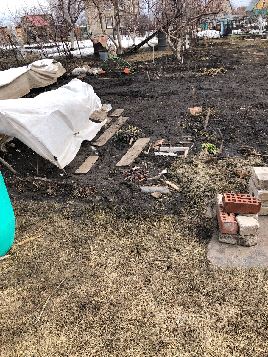 Дорогие друзья и гости канала! Рада всем кто заглянул ко мне на огонек! Прошла 5 дней с моего последнего посещения сада. И сегодня я была там. Не очень сильно, что-то изменилось, чего и следовало ожидать. Погода забыла, что на дворе апрель уже. А в прошлые года, 1-5 мая участок под овощи уже пахали. Очень интересно сравнить погода догонит или нет саму себя. Была веская причина для поездки, увезла посылку с розами, т.к. на лоджии ей жарко, а открыть окно не могу, рассада может замерзнуть, поставила на пол в домике. Температура в комнате +5, перед тем как ехать домой, переставила коробку на коврик, как бы не замерзли розочки, жалко будет. Приехала, надо полезное, что-то сделать, поработать для души. Посмотрела розы, в дальнем, Розовом розарии, немного прорыхлила, земля начала оттаивать, но совсем немного. В розариях все без изменения, фотографировать даже не стала, до лучших времен подождем. Самое снежное место вдоль забора, малина вытаивает, а винограда почти не видно. Размотала слив