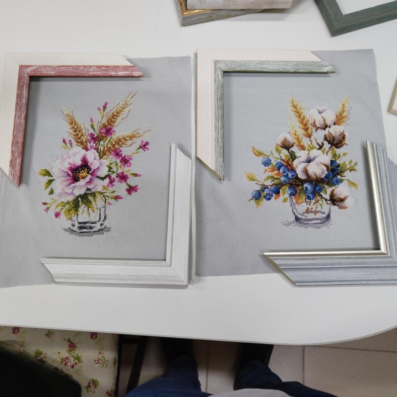 Не могу решить какой вариант оформления мне нравится больше. С хлопком еще накосячила. Неправильно середину посчитала. А еще у меня лошадка есть. Багет, конечно, стоит нынче, как полет в космос. В две мастерские заходила, и обе девочки-сотрудники — «Ой, лошааааадка!!!». Да она и мне тоже очень нравится, но я ее вряд ли оформлю, на самом деле. Надо выбрать. Верх или низ.