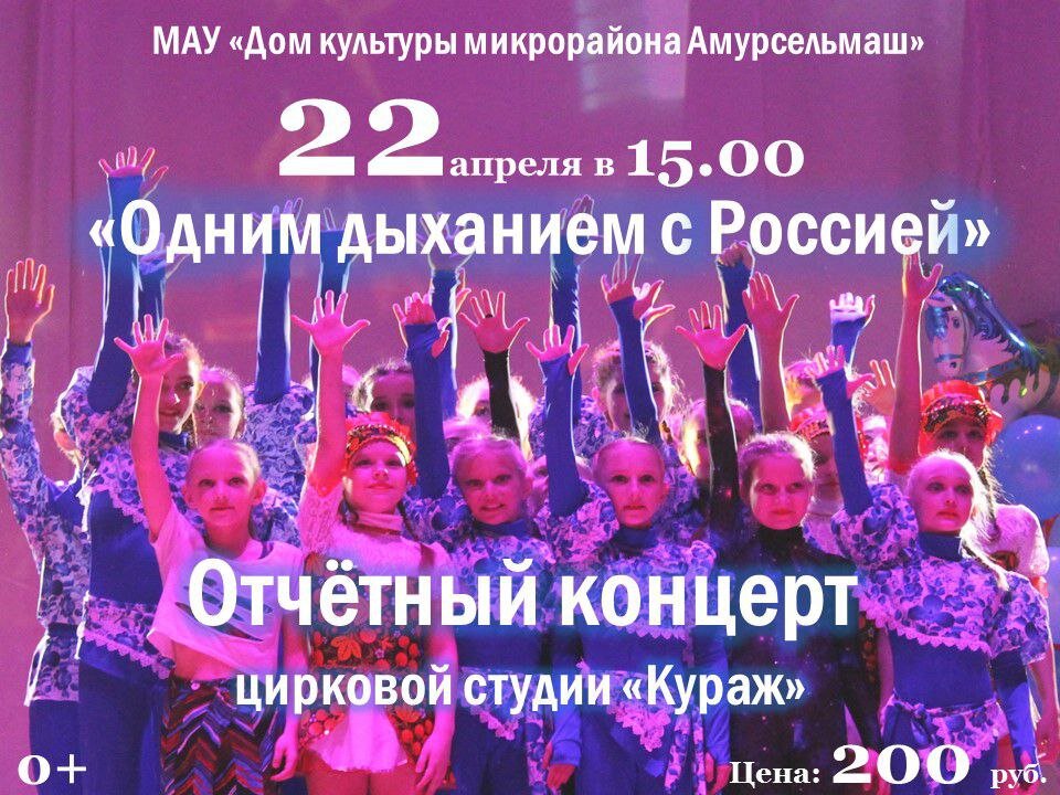 Дом культуры «Амурсельмаш» приглашает жителей Белогорска на отчетный концерт «Одним дыханием с Россией» цирковой студии «Кураж». Он состоится 22 апреля в 15.00. — Отчетный концерт — это уникальная возможность показать свои умения и удивить зрителя, — отметила директор ДК «Амурсельмаш» Маргарита Терещенко. — А нашим артистам есть, чем удивить зрителей. Репертуар коллектива разнообразен: групповые и сольные номера, воздушные гимнастки, номера с эквилибром на моноциклах и катушках и многое другое. Зрителей ждут новые концертные номера в народном, современном стилях, яркие сценические образы, которые не оставят никого равнодушными. Цена билета: 200 рублей. Телефон: 5-72-71. Билеты можно приобрести онлайн: https://quicktickets.ru/belogorsk-dk-amurselmash