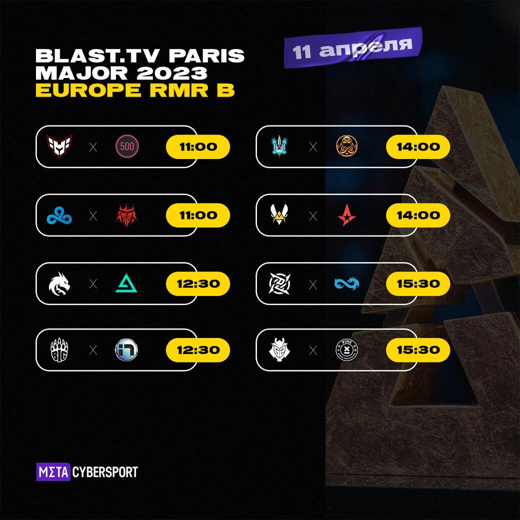 11 апреля пройдут первые матчи BLAST.tv Paris Major 2023 Europe RMR B по CS:GO. Стартовые встречи начнутся в 11:00 по московскому времени. В формате best-of-1 сыграют Heroic – 500, Cloud9 – forZe. Следом в 12:30 по московскому времени сразятся Team Spirit – Aurora и BIG – iNation. В 14:00 по московскому времени ENCE встретится с Monte, а Team Vitality сыграет с Astralis. Два оставшихся матча запланированы на 15:30 по московскому времени. NiP сразится с Eternal Fire, а G2 Esports сыграет с 9INE. Расписание может быть изменено из-за возможных технических проблем или из-за долгой игры команд. Все матчи первого тура пройдут в формате best-of-1. Кроме этого, 11 апреля будут сыграны первые встречи второго тура. BLAST.tv Paris Major 2023 Europe RMR B пройдёт с 11 по 15 апреля в Копенгагене, Дания. 16 команд разыгрывают 11 путёвок в разные стадии парижского мейджора.