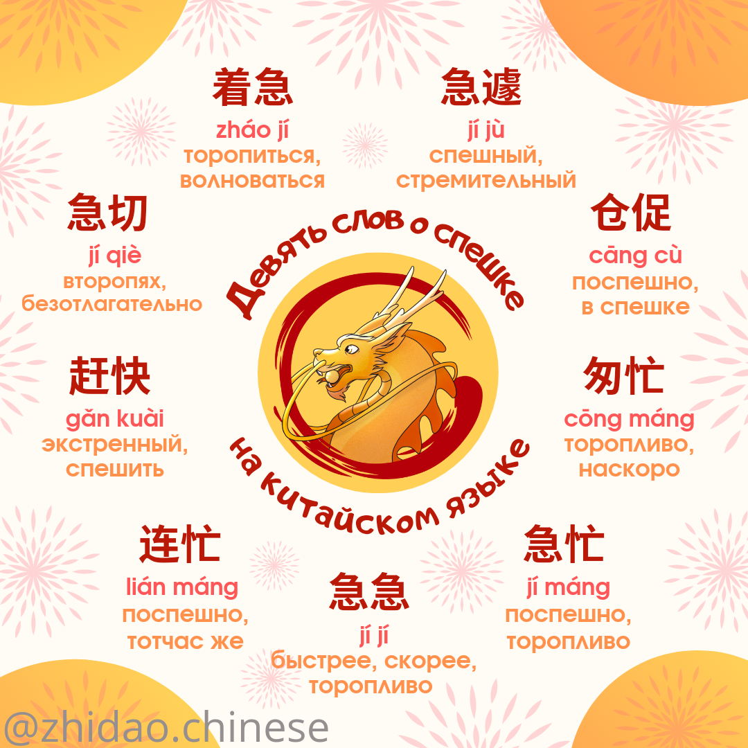 #zhidao_способы_сказать💭 Все мы регулярно куда-нибудь торопимся, поэтому сегодня решили поделиться с вами девятью словами, описывающими спешку 🏃 1️⃣ 着急 zháo jí торопиться, волноваться 2️⃣ 急遽 jí jù спешный, стремительный 3️⃣ 仓促 cāng cù поспешно, в спешке 4️⃣ 匆忙 cōng máng торопливо, наскоро 5️⃣ 急忙 jí máng поспешно, торопливо 6️⃣ 急急 jí jí быстрее, скорее, торопливо 7️⃣ 连忙 lián máng поспешно, тотчас же 8️⃣ 赶快 gǎn kuài экстренный, спешить 9️⃣ 急切 jí qiè второпях, безотлагательно 📝 Ссылка на карточки Quizlet для изучения новых слов: ❗В Quizlet вы можете послушать произношение всех фраз! Для этого нажмите на значок микрофона 🔊 📚 Хотите, чтобы Вы или Ваш ребенок заговорили на китайском? Напишите нам для записи на групповые / индивидуальные занятия! 🎓
