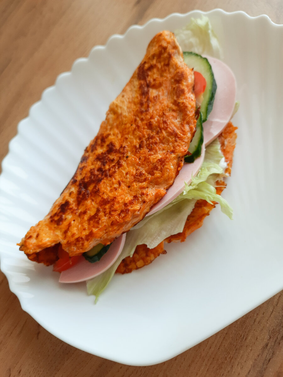 Кбжу на порцию-148ккл.у-10гр,ж-15гр,б-15гр. Морковь 100гр Сыр легкий 15гр Яйцо 1 шт Все смешать для вкуса любимые приправы,я положила соль перец и копчёной паприка Жарим на огне под медленном огне под крышкой.У меня начинка творожный сыр+колбаса=228ккл.Приятного аппетита!