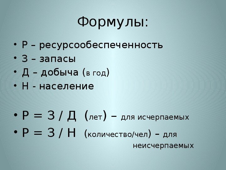 При рассмотрении природных ресурсов важно оценивать ресурсообеспеченность, т.е. соотношение между разведанными запасами ресурсов и объемами их использования. Ресурсообеспеченность исчерпаемых невозобновляемых ресурсов оценивается количеством лет, на которые хватит этих ресурсов при современном уровне добычи. Для возобновляемых ресурсов определяют величину этих ресурсов, приходящуюся на душу населения.