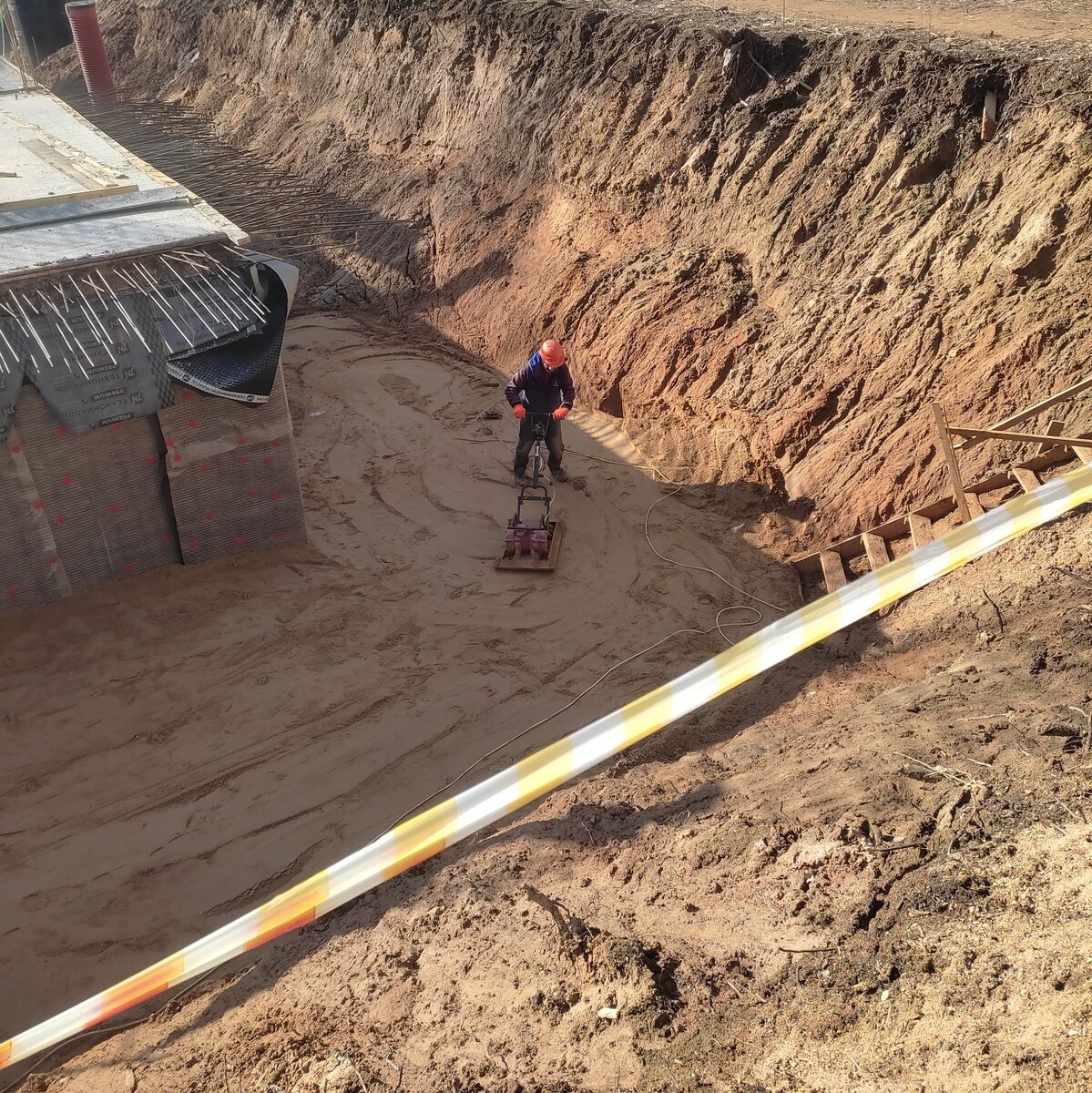Параллельно идет обратная засыпка котлована с послойной трамбовкой, прием материалов от нашего партнера — компании @unimart24. Каждый день здесь трудятся более 40 человек при поддержке техники.