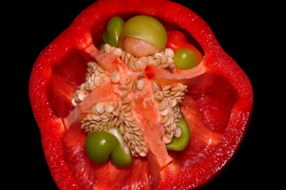 Возможно, когда вы разрезали перец, вы находили внутри уменьшенную версию другого перца. Как так получилось? Что это за волшебство? Можно ли есть этот перец? Да, такой перец съедобен. Более полувека назад трое исследователей из Калифорнийского университета, точнее в 1966 году, изучавшие любопытный случай роста перца внутри другого перца, назвали это явление «внутренним размножением», форма которого может варьироваться. Семена внутри овощей, таких как болгарский перец, начинаются как семяпочки: растительная версия клеточных яиц. На стадии цветения они ждут пыльцы внутри структуры, называемой плодолистиком, внешняя часть которого становится плодом перца. Мы получаем перец, когда пыльца попадает в верхнюю часть этого плодолистика. Сперматозоиды в этой пыльце перемещаются к яйцам и оплодотворяют их, в результате чего яйца становятся семенами, а внешняя часть плодолистика — плодами. Однако в болгарском перце семязачатков много и не все из них оплодотворяются. Иногда неоплодотворенный перец