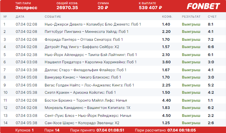 Клиент «Фонбет» собрал экспресс с коэффициентом 26970,35 и выиграл более 500 тыс. рублей. Он ставил только на исходы, коэффициенты по которым варьировались от 1,25 до 4,50. Благодаря большому количеству событий и нескольким рискованным ставкам общий коэффициент купона оказался невероятно высоким. Для клиента «Фонбет» не составило труда предсказать победу «Далласа» над «Филадельфией». Безусловно, нижегородец был в курсе проблем «Флайерз», которые по итогам регулярного чемпионата уже не сумеют подняться выше 14-го места в Восточной конференции. К тому же перед поединком с «Далласом» «Филадельфия» уступила в четырех встречах подряд. В свою очередь «Старз» выиграли три из четырех последних матчей. В очном противостоянии команд обошлось без сюрпризов — хозяева победили со счетом 4:1. А во встрече «Детройта» и «Баффало» клиент решил перестраховаться и поставил на то, что гости не уступят в основное время. Он явно сверялся со статистикой, которая намекала, что победитель матча, вероятно, не о
