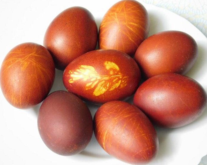 Самым распространенным красителем, пожалуй, является луковая шелуха. Еще с детства помню эти моменты когда вместо супа в кастрюли зачем то варилась луковая шелуха. Для придания бордового цвета, возьмите белую и красную шелухи, залейте холодной водой и варите около получаса после закипания на среднем огне. Остудите, процедите. Краситель готов. Далее положите яйца в раствор и варите на медленном огне до готовности. Для придания насыщенного оттенка подержите их еще немного в красителе.