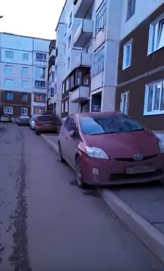 На фото: автомобили, стоящие на тротуаре во дворе одного из МКД в Братске (скриншот с видео от 07.04.2023 г.)