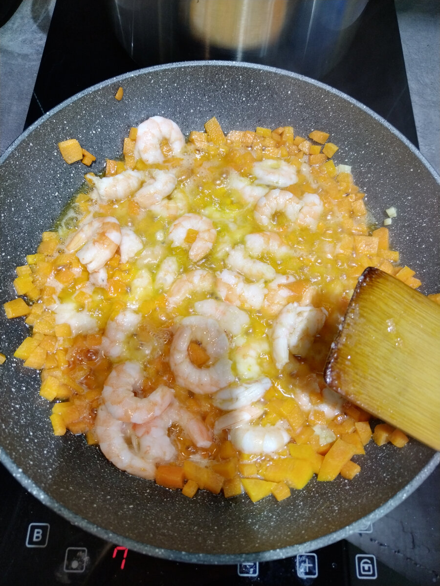 Всем привет! Как обещала, несу рецепт приготовления тайского жареного риса. Нам понадобится: 1 морковь Зелёный лук 2 зубчика чеснока 200 гр очищенных креветок ( или куриной грудки) 2 яйца 1 стакан риса жасмин или другого тонкого длинного риса Соевый соус Сахар Устричный соус Такое блюдо идеально готовить в вок сковороде, но если у вас,как и у меня ее нет - ничего страшного, обойдёмся простой сковородой. Также хочу отметить, что рецептов много разных, я делюсь с вами своим. Рис отвариваем по инструкции. Морковку режем мелкими кубиками, чеснок нарезаем мелко и все это отправляем в разогретое на сковороде масло (масла не жалейте). Обжариваем на сильном огне буквально минуту. Затем отправляем туда же очищенные креветки или куриное мясо, или и то и другое ☺️. Так же обжариваем минуту на сильном огне. Вливаем соевый соус, устричный соус, добавляем две столовые ложки сахара. Всыпаем наш рис, порубленный зелёный лук. Всё перемешиваем. Теперь отодвинем рис, немного освободив место. Вли