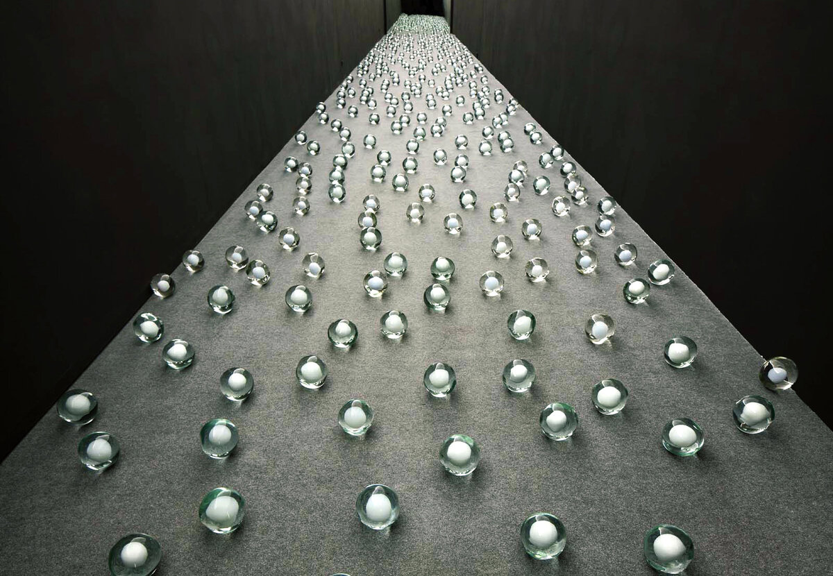 Нот Витал, «700 снежков», 2013, муранское стекло. Инсталляция, состоящая из 700 стеклянных сфер, которые похожи на снежки, зависшие в воздухе. Каждая сфера сделана вручную, поэтому нет двух одинаковых, как никогда не повторяются природные элементы. Свойства прозрачного и белого стекла передают непостоянный характер снега. Это отражает напряжение между органической формой и неорганическим материалом, между долговечностью произведения искусства и эфемерностью его прототипа. Источник: patersonzevi.com
