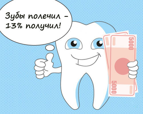 Посещение стоматолога часто влетает в копеечку. Однако не все знают, что 13% от потраченных денег можно вернуть. Это социальный налоговый вычет, при котором гражданину возвращается расходов на лечение. Практически каждый работающий человек получает зарплату, с которой его работодатель отчисляет налог на доходы. Однако можно этот налог уменьшить на социальные вычеты. И тогда деньги, перечисленные работодателем в бюджет, возвращаются гражданину. Например, Сергей Иванов потратил на лечение зубов 50 000 руб. и на установку имплантов 90 000 руб. Сергею можно вернуть 18 200 руб. (50 000 руб. * 13% + 90 000 руб. * 13%). Причем социальный вычет можно получить при лечении зубов не только себе, но и супругу, родителям и детям. Получается такой законодательный кэшбэк! Приведем примеры услуг дантиста, за которые можно получить соцвычет: