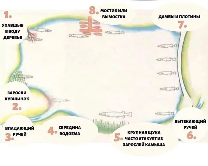 - Вытекающий ручей - это место, где щука может охотиться на рыбу, которая плавает в сторону ручья. Попробуйте забросить приманку в точку, где ручей вытекает из озера.
