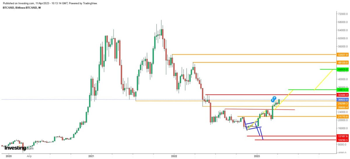 Первый график недельный таймфрейм. А вот на втором - дневной. Как видим из него, там сформировалась еще фигура "бычий вымпел" с целью 36,3к$