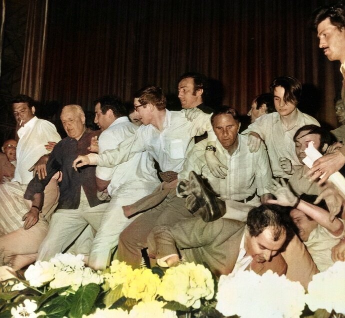 «Кто мог предположить в часы торжественного открытия фестиваля [1968 года], что очень скоро его сорвут, объявят вредным, ненужным, несвоевременным? … Уже в первые дни из Парижа стали поступать тревожные вести: забастовки на заводах, студенческие волнения, схватки с полицией в Латинском квартале. Но фестиваль продолжал жить в привычном ритме. «Утренняя Ницца» заполняла свои страницы светской хроникой и портретами звезд. Обсуждали туалеты, прически, взвешивали шансы на успех Алена Рене, Янчо, Дзурлини. Тем временем в Канн нагрянули из Парижа эмиссары «Генеральных Штатов французской кинематографии» — так в стиле декретов Великой французской революции подписали манифест о реформе национальной кинематографии левонастроенные радикальные интеллигенты. В числе прочих было требование,— в знак солидарности с бастующей Францией закрыть буржуазный Каннский фестиваль как не соответствующий своему назначению. Осуществить эту акцию Генеральные Штаты поручили режиссерам Жан-Люку Годару, Клоду Лелюшу и