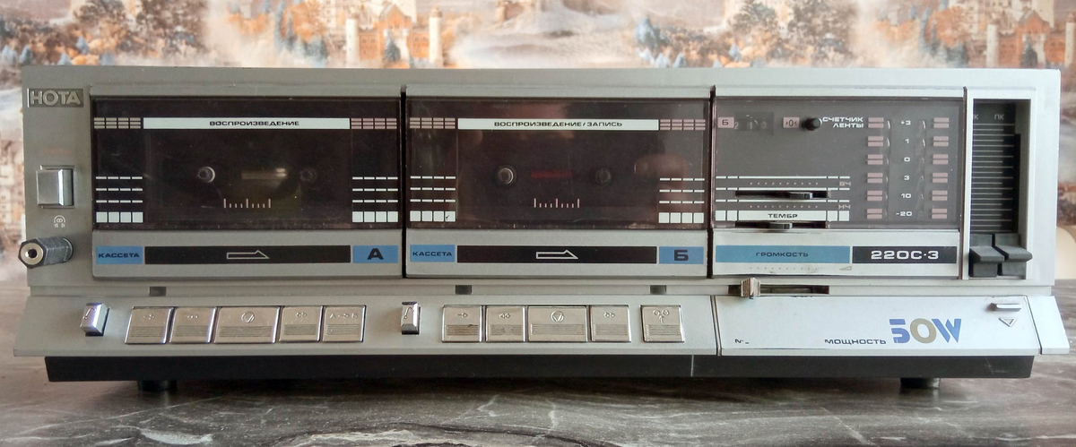 Всем привет! С вами Дядя Джек! Я тут тихо мирно в шкатулочке знаний, что ноут-буком зовется, кнопочки перебирал, и вдруг мне такое показали. Прям такое. Я шокера словил. Так аппарат еще историю имеет такую, словно в будущем побывал. В общем суть. Где-то в 80х начали делать Нота 220. Повыпускали ее лет 5 и с производства сняли. На смену ей в 1993м году пришла сегодняшняя Нота 220С-3. Повыпускали ее года 3, и тоже сняли с производства. И вернулись к Нота 220. И еще лет 5 ее выпускали. Но это бы ладно. источник фото http://rw6ase.narod.ru/index1/mag_ml/mg_kas_set/nota_m220s3.html Давайте мельком про Ноту-то эту. Тут видите какой окрас корпуса? Она прям в ядреном огненном дизайне!!! Прям крутая крутая. Серьезный монстр. А видите надпись 50W? Это они так заявляют, что у них тут 50 Ваттный усилитель. Смотрите дальше. источник фото http://rw6ase.narod.ru/index1/mag_ml/mg_kas_set/nota_m220s3.html Вон там вдали - это мотор. Он от катушечного магнитофона. Он крутит сразу оба кассе