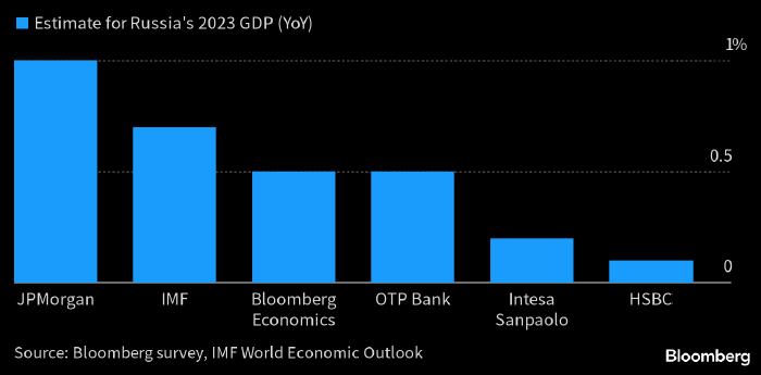 Несмотря на все разговоры о негативном влиянии западных санкций на экономику России, МВФ смотрит на ее перспективы с оптимизмом. В опубликованном сегодня прогнозе Фонд повысил оценку роста ВВП РФ в 2023 году до 0,7% с 0,3%. Наиболее оптимистичные прогнозы по темпам роста ВВП РФ в 2023 году. Источник: Bloomberg Несмотря на все разговоры о негативном влиянии западных санкций на экономику России, МВФ смотрит на ее перспективы с оптимизмом. В опубликованном сегодня апрельском экономическом прогнозе Фонд повысил прогноз по росту ВВП РФ в 2023 году до 0,7%. Эта цифра — второй самый оптимистичный прогноз после прогноза JPMorgan на уровне +1,0%, тогда как медианный прогноз экономистов, которых мониторит Bloomberg, предполагает сжатие экономики РФ на 1,7%. Отметим, что в январе МВФ полагал, что в текущем году ВВП РФ вырастет лишь на 0,3%. Изменения прогнозов МВФ по темпам роста ВВП некоторых стран мира в 2023 (синим) и 2024 (оранжевым) годах по сравнению с январскими оценками. Источник: Bloombe