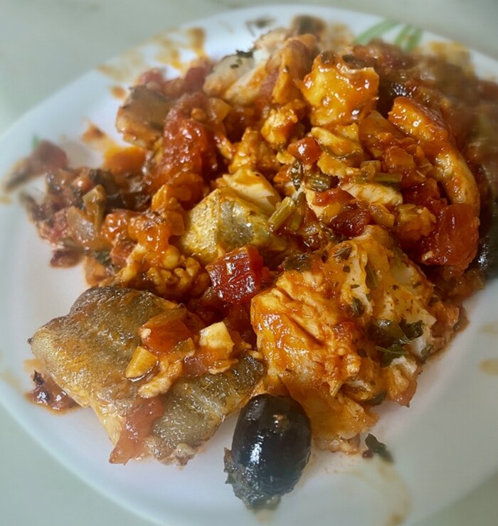 Сначала поворчать. Приготовленную таким образом рыбу: будь то треска или, например, хек какой, а то и нототению (имя то какое!) готовили, по-моему, всегда. И ели с удовольствием, что характерно и в горячем, и в холодном виде. И пока не наступил капитализм никто и не знал, что это рыба не просто там «в томатном соусе», а «рыба по-провансальски»!!! И всего то надо было добавить горсть маслинок, да масло брать не подсолнечное или кукурузное, а оливковое. Но называйте, как хотите, но суть от этого не изменится. Рыба получилась вкусная. Очень. В этот раз будет треска. Я еще помню, когда этой рыбой были завалены все магазины, «до потолка», что называется. Её еще называли «московской осетриной». Почему «московской»? Ну так я в Москве же вырос. Поэтом такое название и помню. Вот она – треска мурманская. Две рыбки – семьсот граммов. Мелочь. Нет, правда, мне почему-то помнится, что треска всегда была крупная. Туши в магазине реально разрубали, чтобы завесить и завернуть. Разделал рыбок. Филирова
